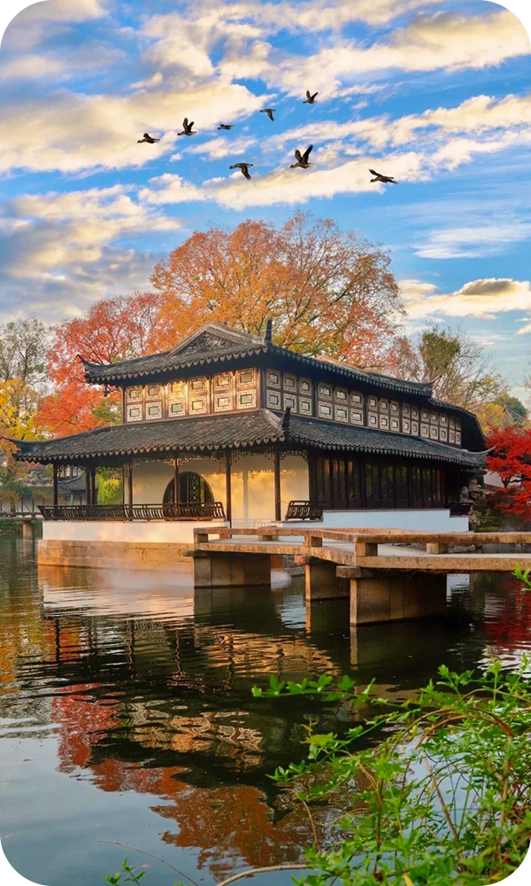 After breakfast, visit the I.M. Pei-designed Suzhou Museum, a blend of traditional and modern architecture. Then explore the Humble Administrator's Garden, a UNESCO World Heritage site embodying classical Chinese landscape art. Next, proceed to Lingshan Town·Nianhua Bay in Wuxi, a scenic lakeside area featuring Tang and Song-style architecture. Finally, check in to the hotel for rest.